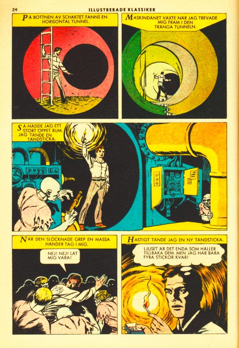 In the bottom of the shaft was an horizontal tunnel. The noise of machinery grew louder when i felt my way along the narrow tunnel. Then I came to a large open space. I stroke a match. When it burned out, I was clutched by several hands. Quickly I struck another match.