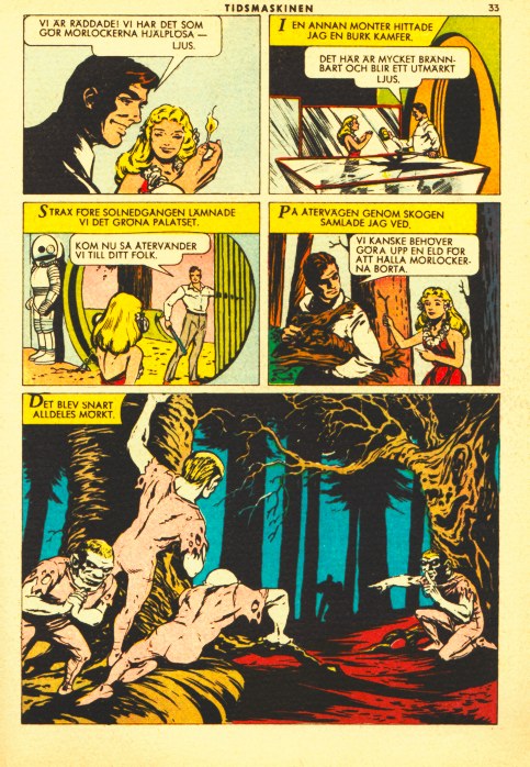 We are saved! Now we have the thing which makes the Morlocks helpless -- light! In an another case i found a jar of camphor. We left the green palace just before sunset. On the way back through the forest I gathered firewood. Soon it went pitch dark.
