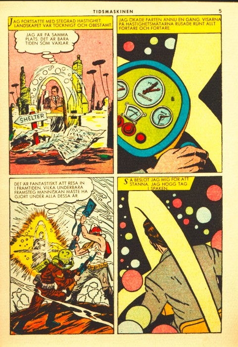 advances of humanity in all these years. So I decided to come to a stop. I grabbed the lever. * Note the irony on panel three: The Time Traveller praises the developments of our civilization, but the square shows the Time Traveller watching two fighting soldiers in a war zone! Sandra Petojevic,