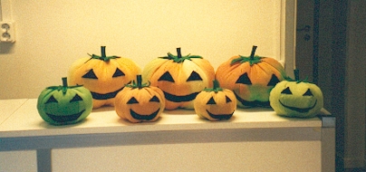 ... och den härligt runda och mjuka pumpan var född. Jag gjorde dem stora, mellanstora och små. Jag gjorde dem orange, gröna och melerade. Alla med glada ansikten! Dessa pumpor sydde jag på mitt arbete som heter Kunnaklara. Klickar du på pumpabilden ovan så kommer du till Kunnaklaras hemsida.