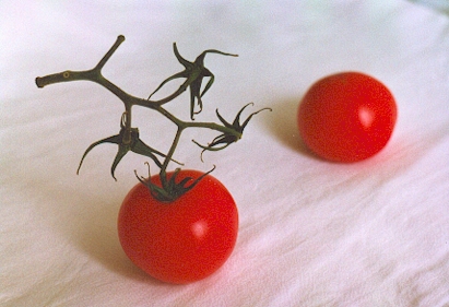 Men även helt klotrunda tomater har en intressant form, i synnerhet om den kombineras med en spretig motsatsform, i den nedre bildens fall en kvist som hör till.