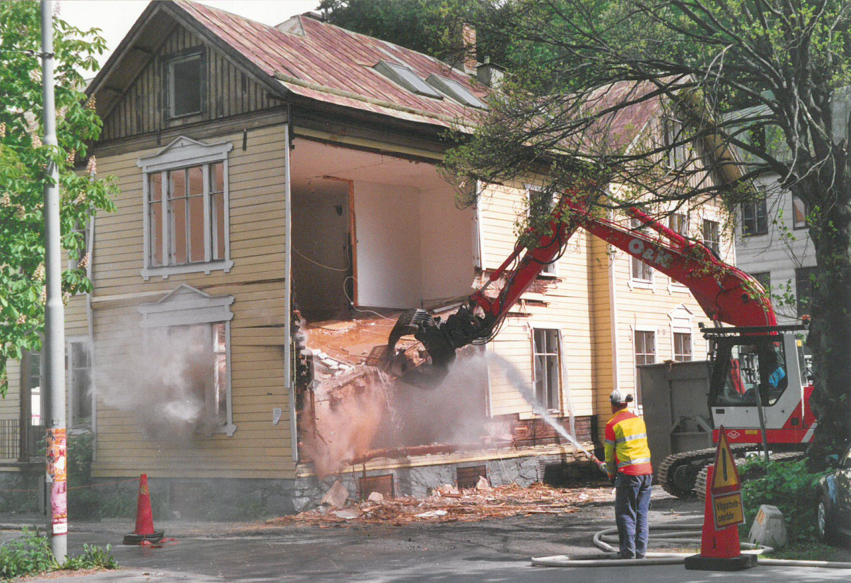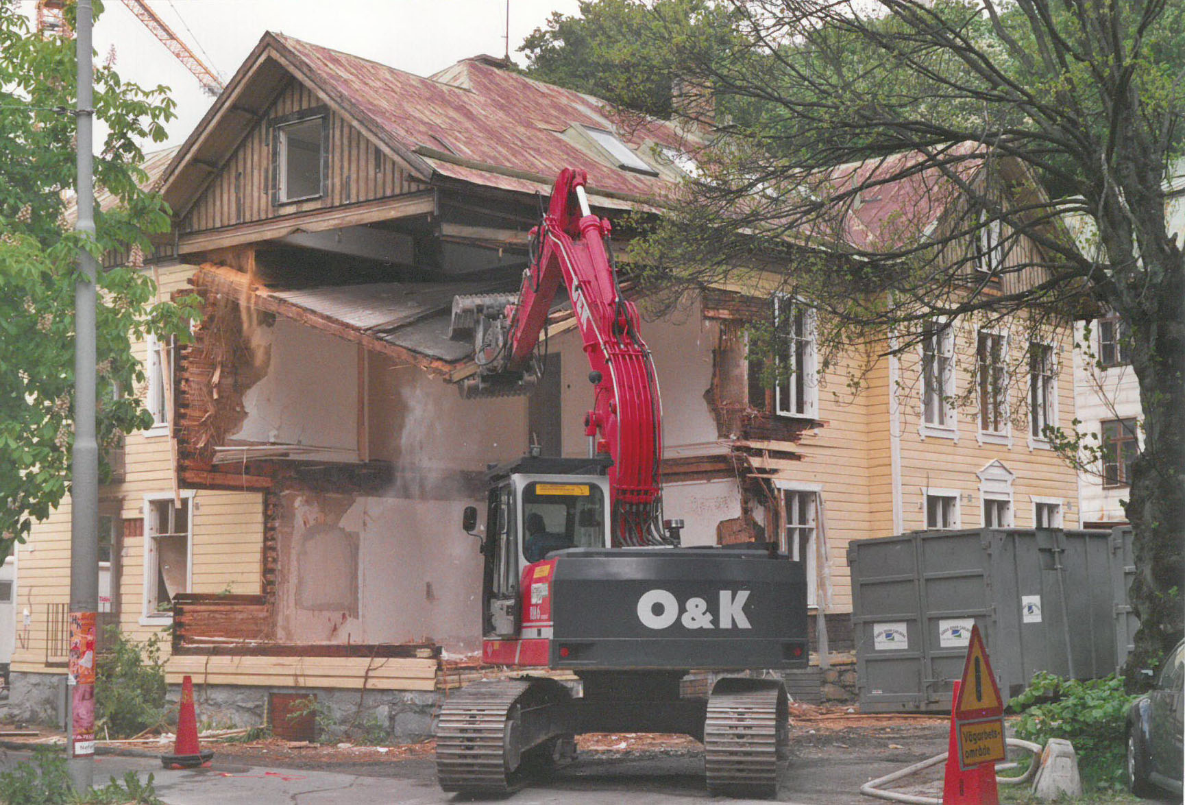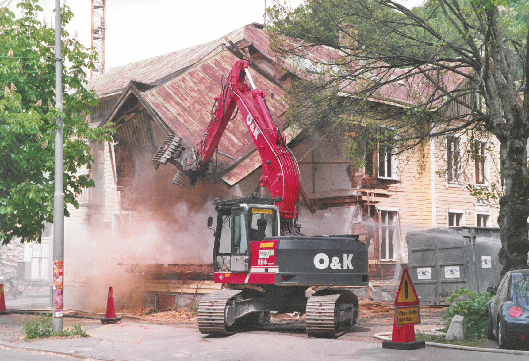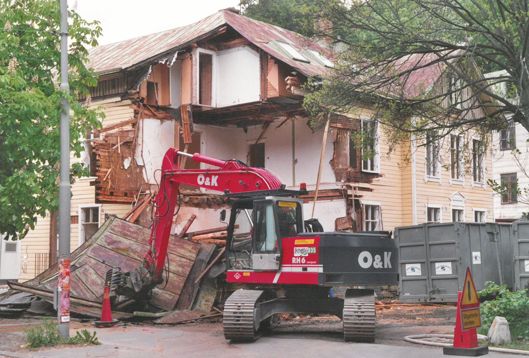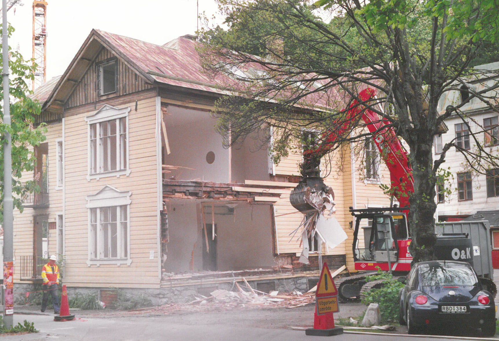 Senare delen av maj år 2000 rivs den gula vandrarhemsvillan från 1870-talet. Då det är viktigt med källsortering (trä och metall för sig) har den här grävmaskinen en finurlig gripklo istället för den sedvanliga grävskopan, och kan därför nypa och knipsa av huset bit för bit. Men det hindrar inte taket från att kollapsa med ett hiskeligt brak!