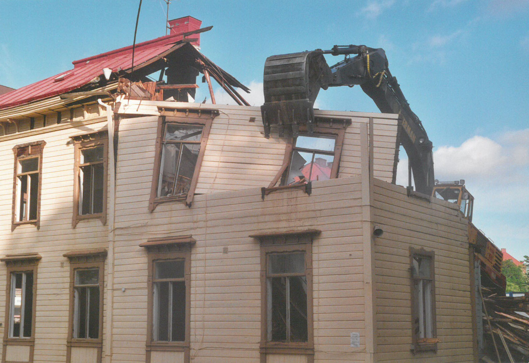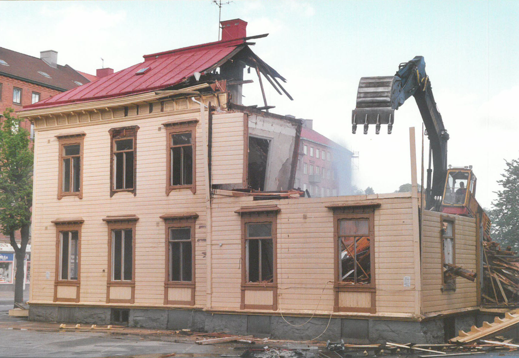 På söndagen den 21 maj 2000 pågick inget rivningsarbete, men Wagneforsvillan stod där på Södra vägen 58 och såg hemsk ut likt en bosnisk ruin efter en bombräd. Det ståtliga tornet var oåterkallerligen borta liksom två tredjedelar av huset. Kring ett fönster saknades snickarglädje, någon som tyckte det var vackert hade lagt vantarna på det i sista stund. Måndagen den 22 maj var det dags igen. Grävskopans käft började med att rasera hela den södra gaveln. Förfärligt nog satt några originalrutor kvar från 1870-talet i fönstren. Det berodde på att de hade pianogångjärn och uppenbarligen hade återbruket inte haft tid nog att skruva loss dem ...