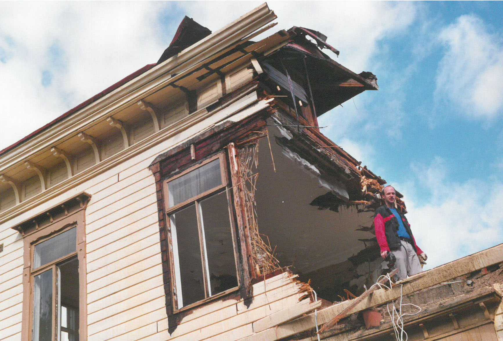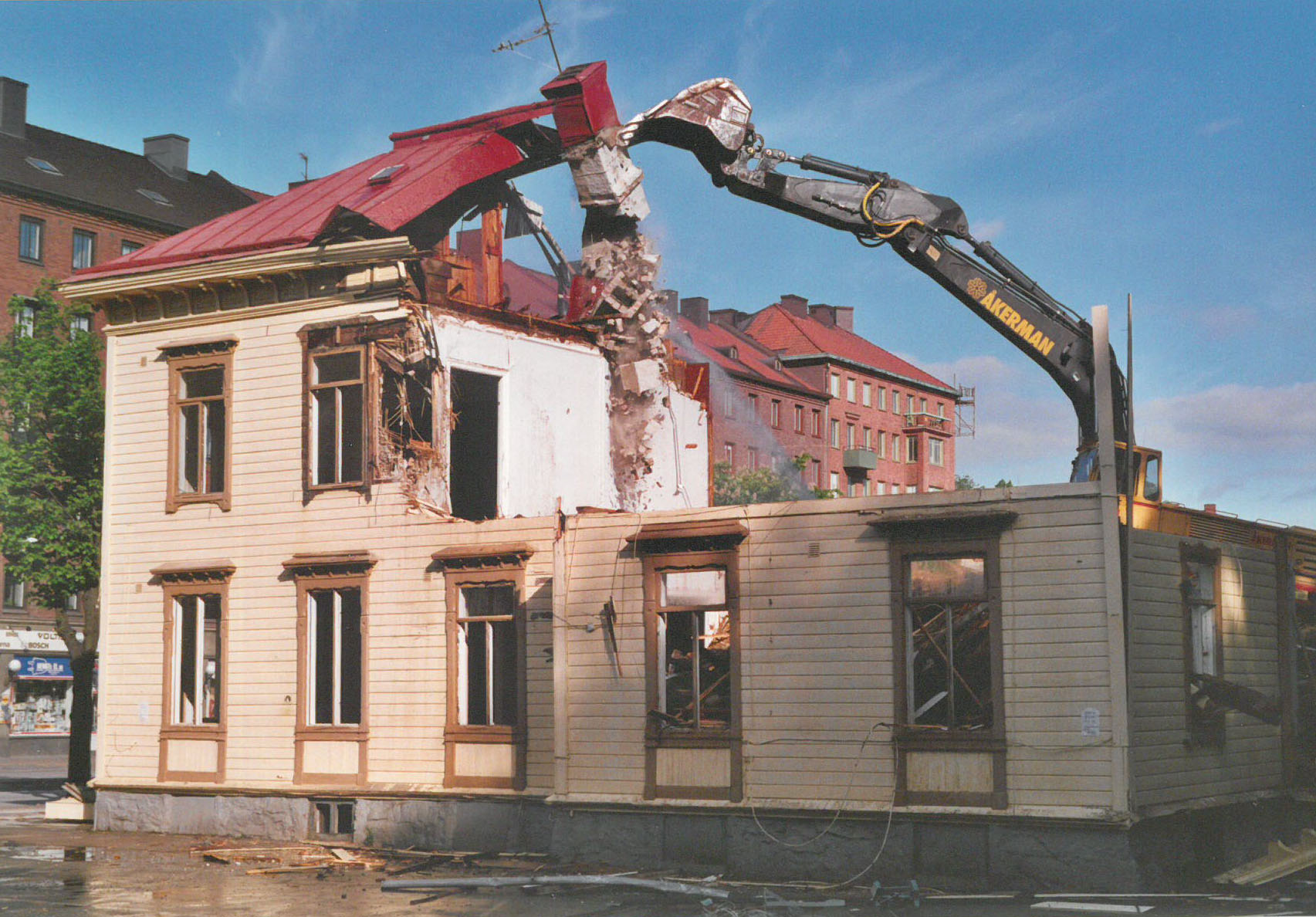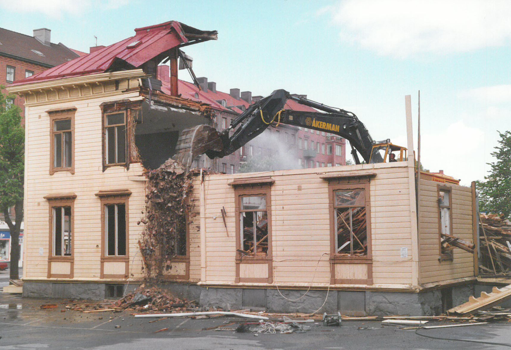 Det enda som fortfarande sticker upp, Wagneforsvillans skorsten, får sig en knuff av grävskopan och faller med ett hiskeligt brak. Sedan skyfflas återstoden av den ner på marken vid huset. Men det som är kvar av huset är faktiskt fortfarande starkt nog att bära en man ...